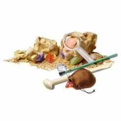 The kit includes 1 plaster block with 8 natural crystals hidden inside, 1 x digging tool, 1 x brush, 1 x magnifier, 1 x set display case with cover and base card, 1 x pouch and a detailed instruction book.