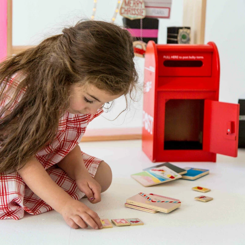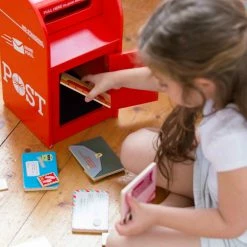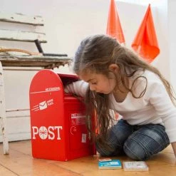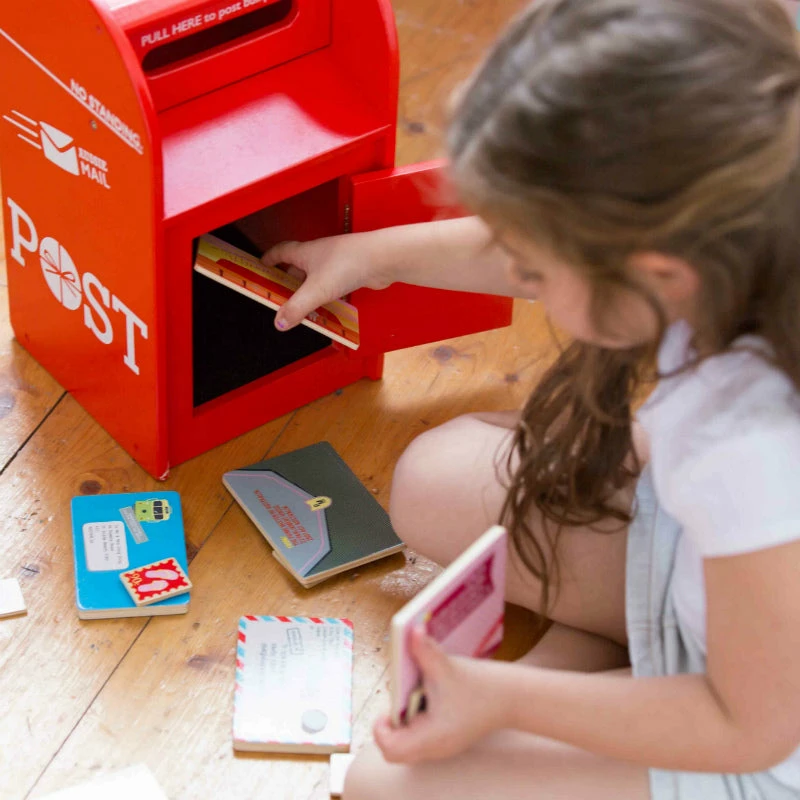 The Post Box is super sturdy measuring 34.5cm tall, 18.5cm wide and 17.5cm long with a slot for letters and a pull-down catch for parcels – just like the real deal. Little hands can attach wooden stamps to the wooden letters and/or postcards for imaginative pretend play using self-sticking Velcro. Place your own Tooth Fairy or Santa letters in this wonderful Post Box to extend your play.